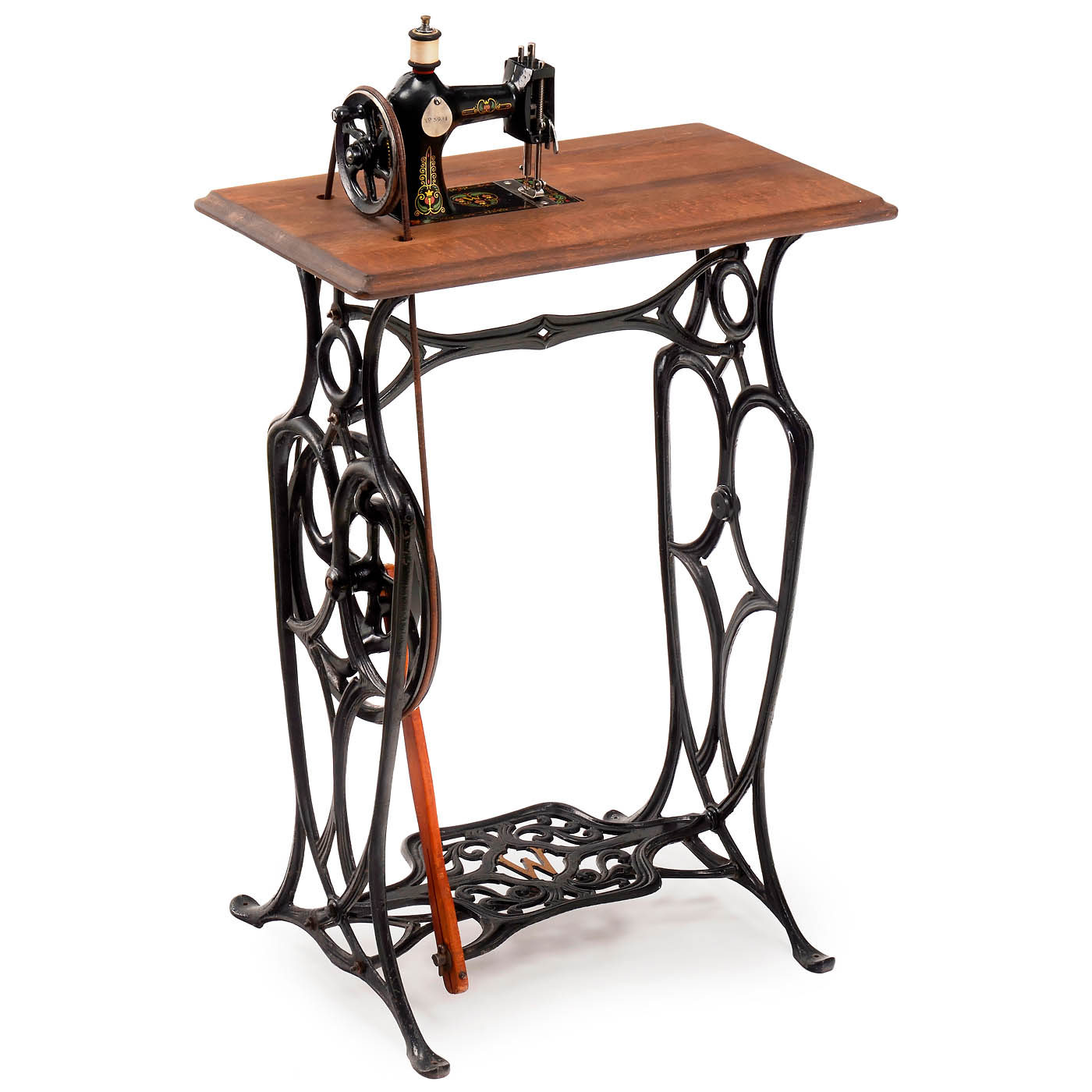 Müller, Berlin. Cast iron, nice original decor, smooth-running, complete with looper (chain stitch), needle and tension. A decorative collector’s item.