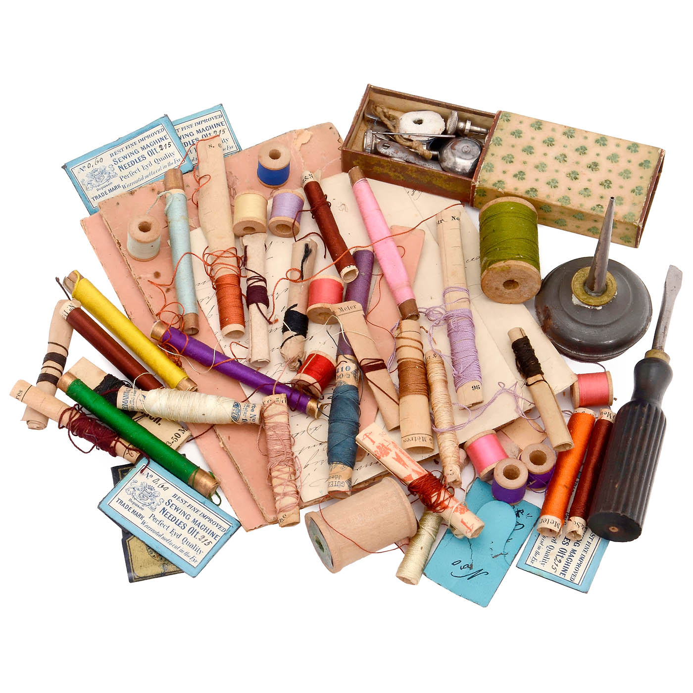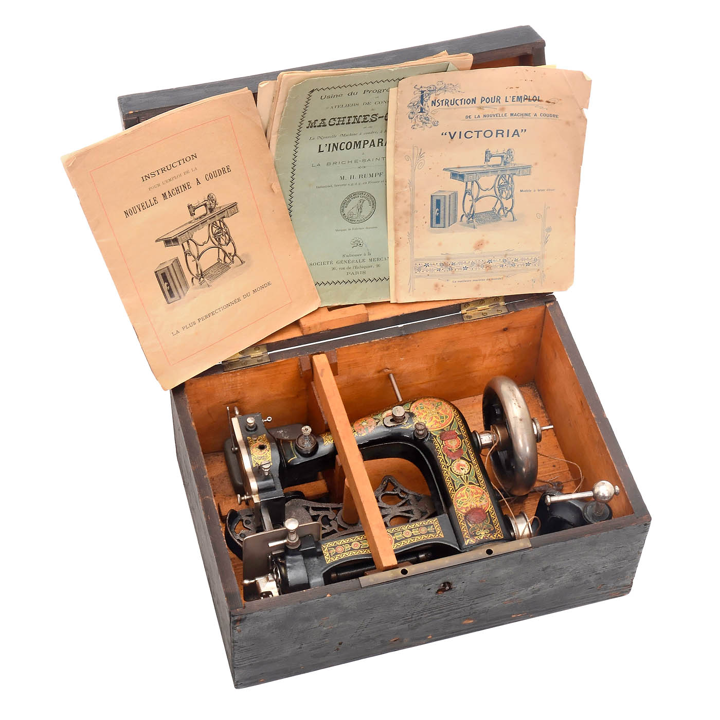 Paris. Comes in original wooden box with clamp, looper, shuttle, a lot of needles and foot pedal to drive the machine by cord. The pantograph for embroidery is missing. Hard to find in such good, and nearly complete condition, no repainting or restoration.
