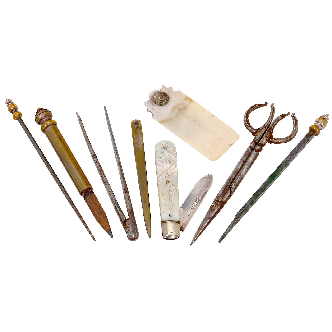 Traveling necessaire for architects or cartographers, silver case covered with high-quality stingray leather, press stud to open the lid, several compartments inside, containing: Small knife with mother-of-pearl handle and hallmarked silver blade, scissors, pencil, pricking compass, spatula, file, two additional items. Height of container 4 in.
