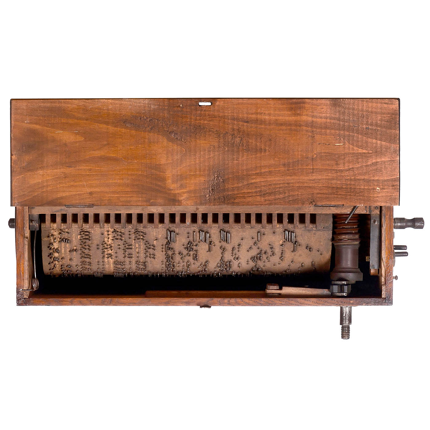 Unmarked, reed organ, with pinned wood barrel playing seven airs, 26 keys and fruitwood case, overall 19?1/3 x 10 1/5 x 18 ? in., barrel 14 ? in., lid and sound fret replaced, very good playing condition.