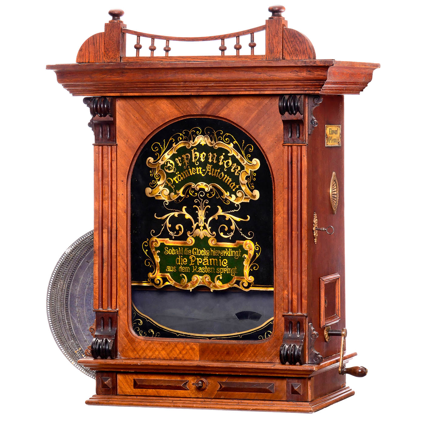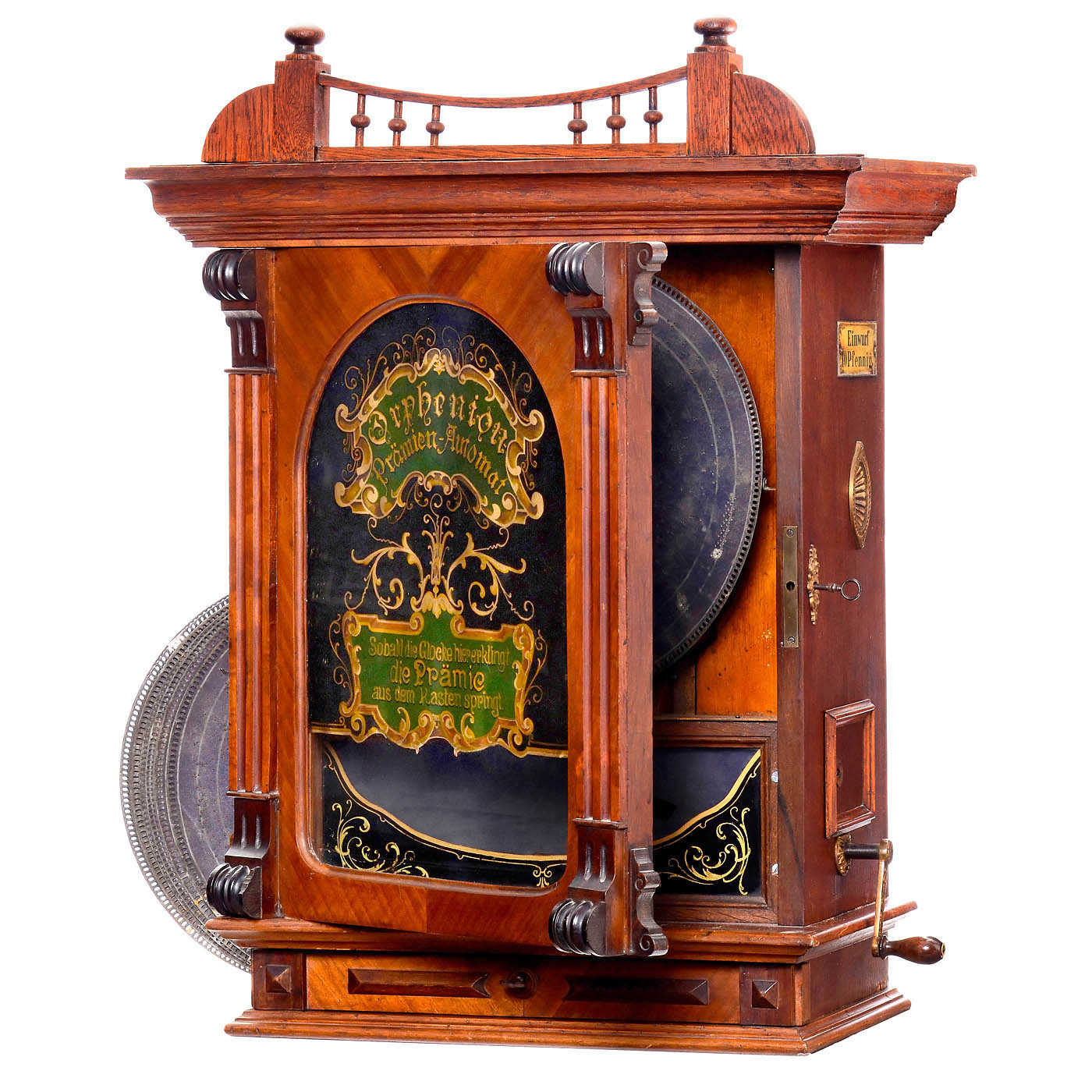 Bruno Rückert Musikwerke, Leipzig. Coin-activated disc musical box for 13 5/8 in. discs, 70 teeth in two combs (4 teeth broken), elegant walnut case, painted cardboard plate behind the front glass, overall size 23 x 13 x 30 ? in., including 9 old discs (partially damaged along the edges). – Good working condition. A rare model that distributes a large beer token or coin after the required number of coins have been deposited.