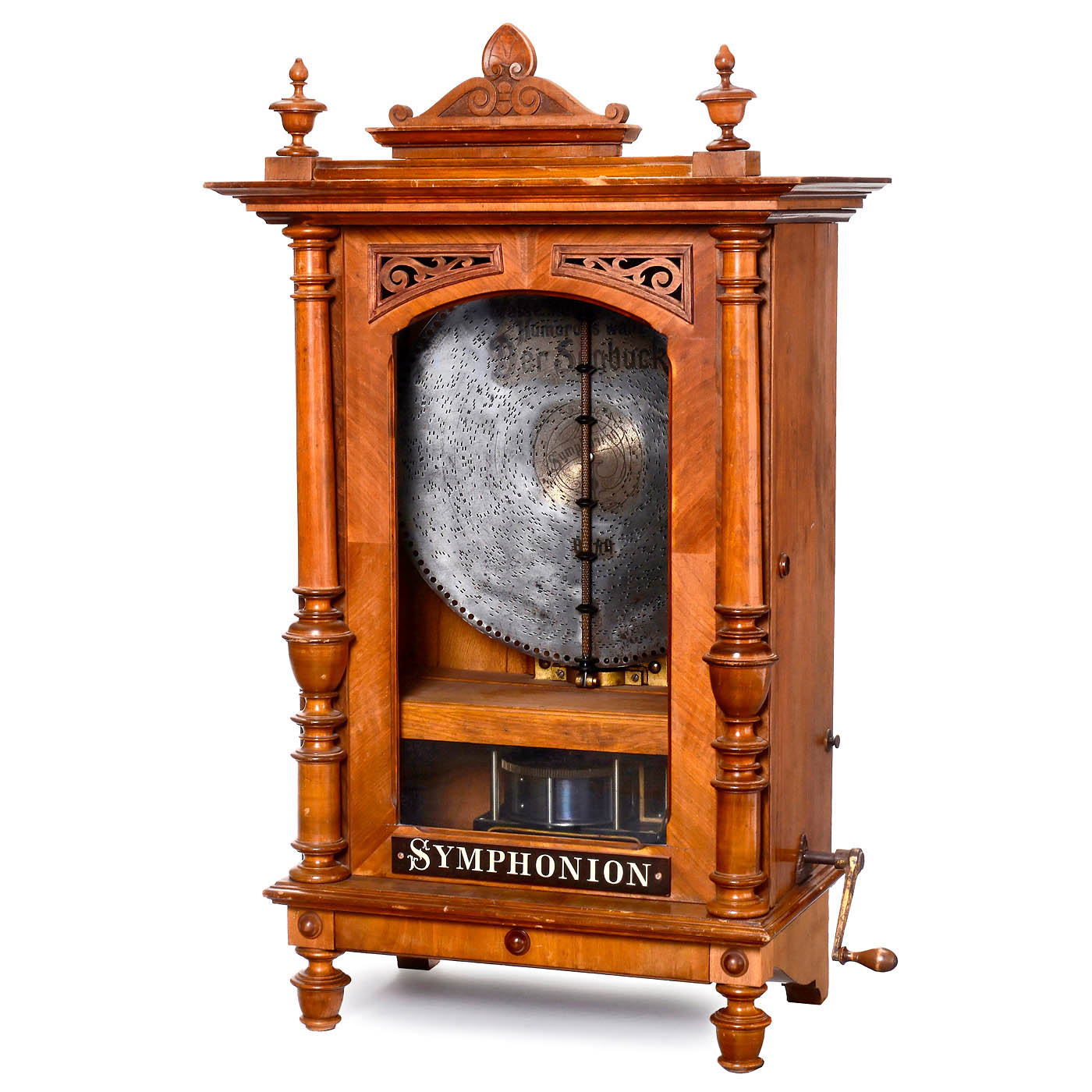 Symphonion Musikwerke, Leipzig. For 19 1/8 in. discs, 106 teeth in duplex music comb (complete), original without coin slot, in carved walnut case with glazed door, replacement pediment, mechanism cover and drawer, height 43 in., with crank and 32 discs in stand. Good playing condition. – With 2 original Symphonion documents.
