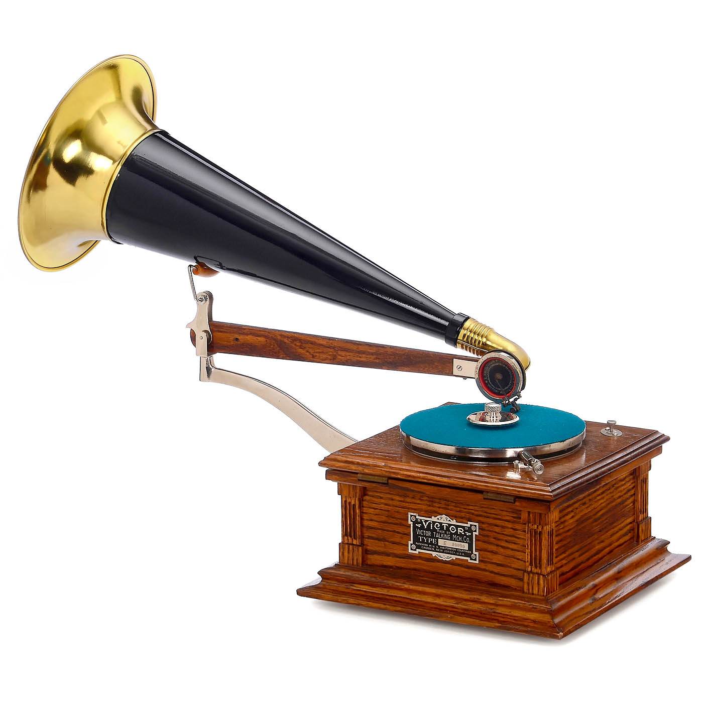 Serial no. 20894, manufactured by "Victor Talking Machine Co.", quarter-sawn oak cabinet with corner columns, "pre-dog" Victor maker's plaque, double-spring motor, 7-inch turntable, traveling arm, "Exhibition" soundbox, brass horn, ? 9 3/4 in., restored, good playing condition, motor somewhat noisy.
