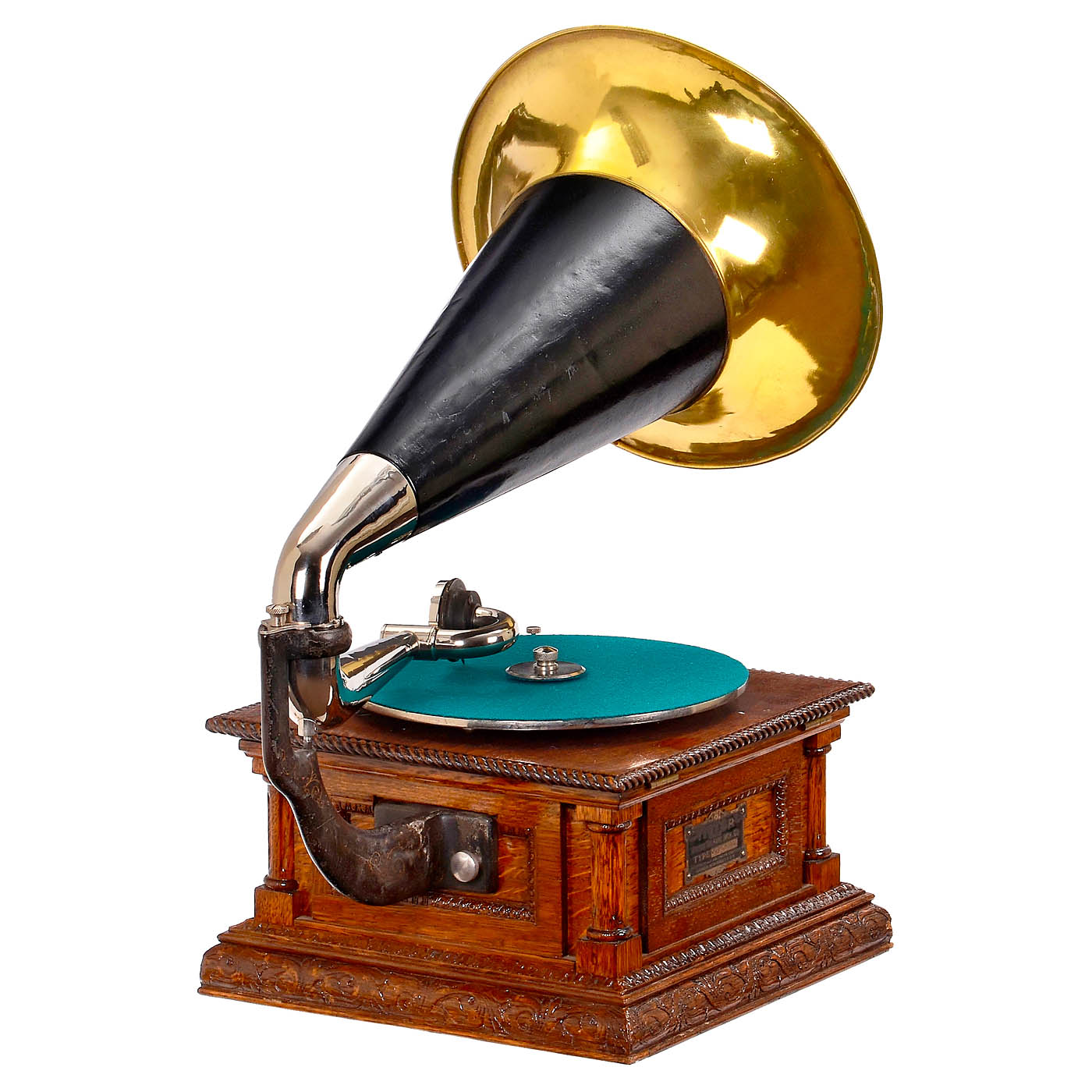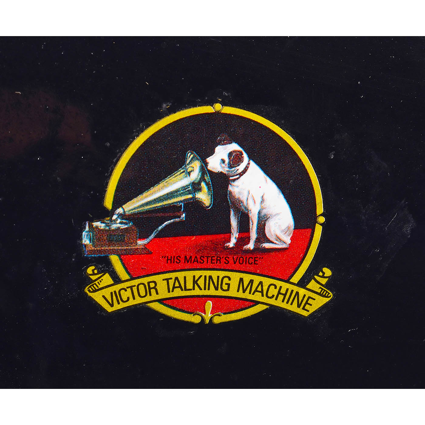 Manufactured by Victor Talking Machine Co., Monarch Special, serial no. 7606, quarter-sawn oak case with maker's plaque, triple-spring motor, 10-inch turntable, "Exhibition" soundbox, taper arm, brass horn with Victor decal, length 19 in., ? 12 ? in., playing condition, speed incorrect.