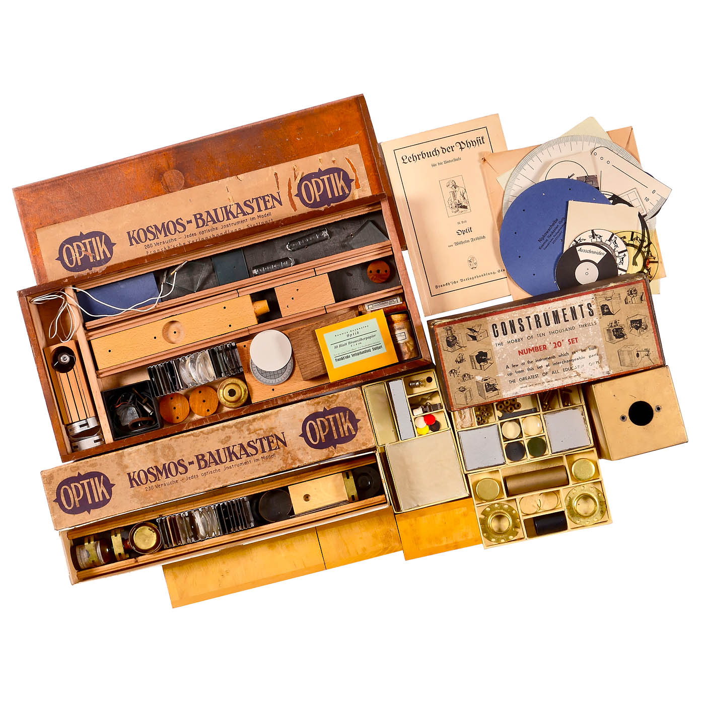 All sets appear to be complete, but contents unchecked. 1–3) Kosmos, Stuttgart. 3 sets: Kosmos Construction Set 230 Experiments (41 x 8 x 7 cm), Kosmos Construction Set 230 Experiments, including the 12-row Nipkow disk (48 x 22 x 6 cm) with "Lehrbuch der Physik … unter Verwendung der Kosmos-Bauk?sten" (Textbook of Physics ... using the Kosmos Construction Sets), 1938, 76 pages, and the Dutch version in the decorative "Opticus" box (38 x 22 x 6 cm), with a 48-page text booklet. – 4) Le Matériel d’enseignement, Bourg-la-Reine. Récréations Optiques (optical amusements), 23 x 16 x 6 cm, post-1955, complete with a 71-page instruction booklet and the supplements. Very challenging exercises. – And: 5) England. Construments – the hobby of ten thousand thrills – number 20 set, British Patent 345013, 305780 and 289574.
