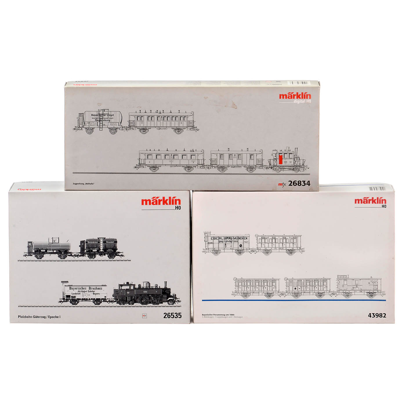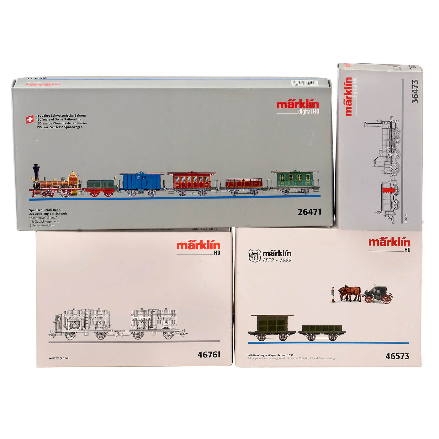 1) No. 26471, Spanish Br?tli Railway train set, Switzerland's first passenger train, with "Limmat" steam locomotive and 4 carriages, digital. – 2) No. 43982, Bavarian Passenger Train c. 1880, with 3 compartment cars, baggage car and beer car. – 3) No. 46761, SNCF wine car set. – 4) No. 26834, Walhalla train set, with PtL 2/2 tank locomotive (of the Royal Bavarian State Railway), 2 passenger cars, 1 mail and baggage car and 1 tank car with brakeman's cab, digital. – 5) No. 36473, Swiss "Rhein" locomotive with tender, digital. – 6) No. 46573, Württemberg car set c. 1859, with 1 equipment transport car with historic carriage and horses and 1 horse transport car. – And: 7) No. 26535, Pfalzbahn freight train, with Royal Bavarian State Railway class D XII tank locomotive and 3 private freight cars. – Packaging shows signs of storage, locomotives and carriages in good condition but untested.