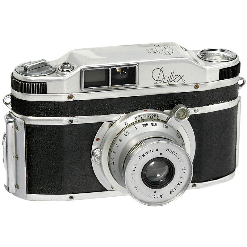 Gamma, Budapest. 单反相机, 带Gamma Artar 3.5/5 cm 镜头, no. L 149127, 镜头可换, 金属卷帘式快门1–1/1000 sec., 光镜和反射取景器. Duflex 是1) 第一台带平视取景器的35mm单反相机,2) 第一台带反射镜的相机,3) 第一台内置自动光圈相机. 1943年就推出, 然而战争期间未完成. 第一台Duflex 出现于1949年. 只生产了几百台. 绝对罕见!