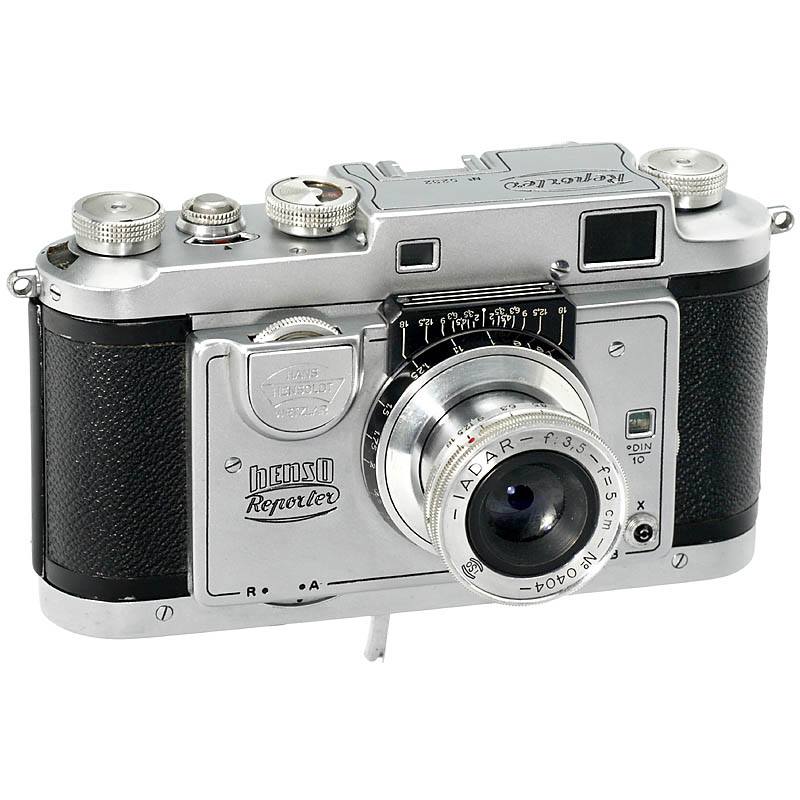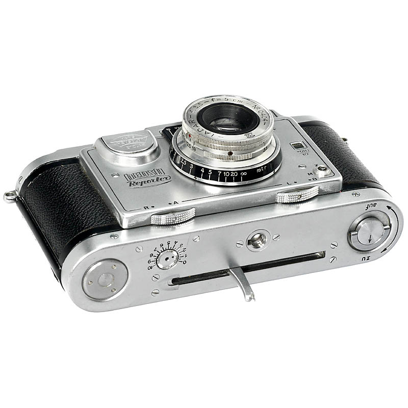 Hensoldt, Wetzlar (ISO制造, 米兰). 借鉴莱卡制造的经典精密相机. 底座上安装了快速过片器. 卷帘式快门1–1/1.000 sec., 屈光度矫正器等. 带罕见ISO IADAR 3.5/5 cm 镜头. 极美的, 时髦的罕见35mm照相机, 镜头成色好.