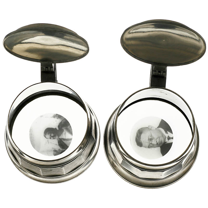 2只啤酒杯, 盖子上有瓷像, 可能是周年纪念品, 每个高15cm