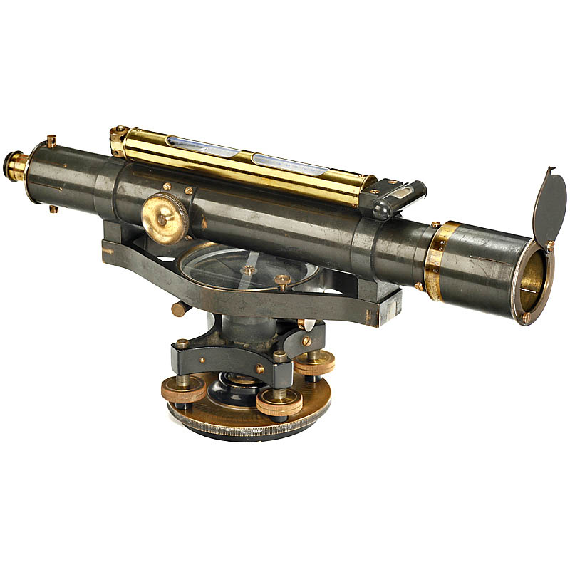 Signed "Stanley Great Turnstile, Holborn, London", serial no. 104166, lacquered brass, with large compassand 2 spirit levels, length of the telescope 15 2/5 in., good condition!
