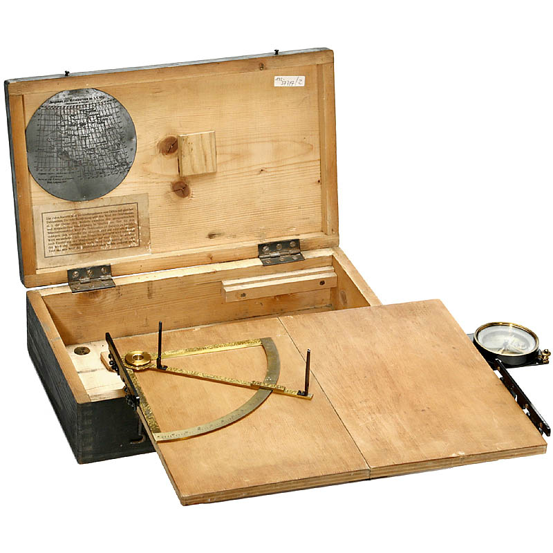 Surveying instrument, used for the declination of maps, signed "Otto A. Ganser, Wien", serial no. 183, with compass and protactor in wooden case.