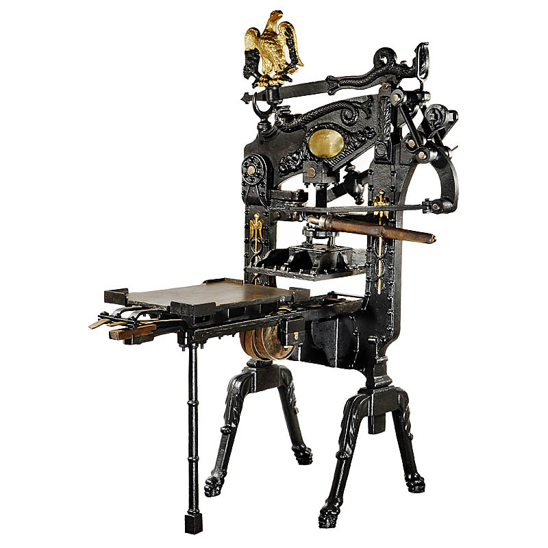Legendary early iron handpress by "Clymer – Dixon & Co., London". Platen size: 12 x 17 2/3 in., height: 68 in., carriage inside: 15 x 22 in. Since 1800 George Clymer, Philadelphia/USA, produced wooden printing presses, but with counterweight principle he invented in 1813 the first major social achievement in iron machine con-struction worldwide! – The rich symbolized decoration, the name and the Eagle as counterweight were George Clymer's reference to his homeland, which he left in 1818 towards England, where he established with his partner Samuel Dixon Europe's most important printing