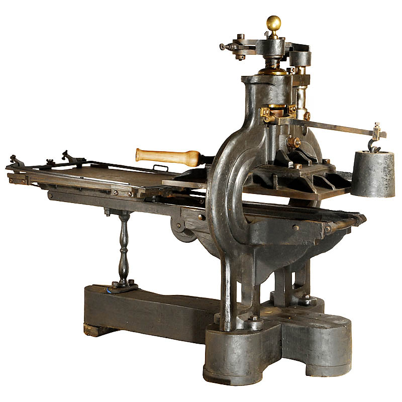 The world's very first all-metal printing press! Designed and manufactured by Lord Earl Stanhope in England. Since Gutenberg's time in the 1450s, there had been no significant change or improvement in the construction of printing presses. Lord Stanhope crated something completely new, the 1st all-metal printing press in serial production, on which the worldwide printing industry was founded. – Platen size: 25 x 34 2/3 in. – Total measures: