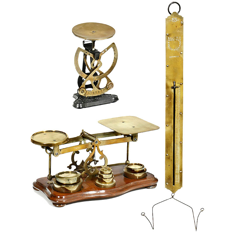 1) English letter scale, manufactured by "Perry & Co., London", brass on wooden base, with set of original brass weights.