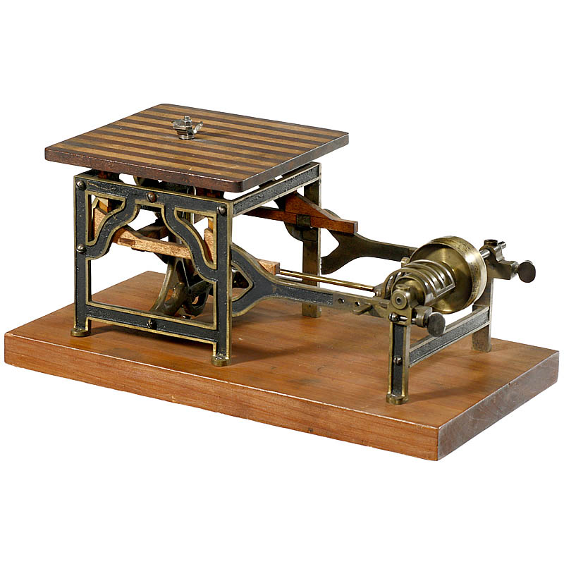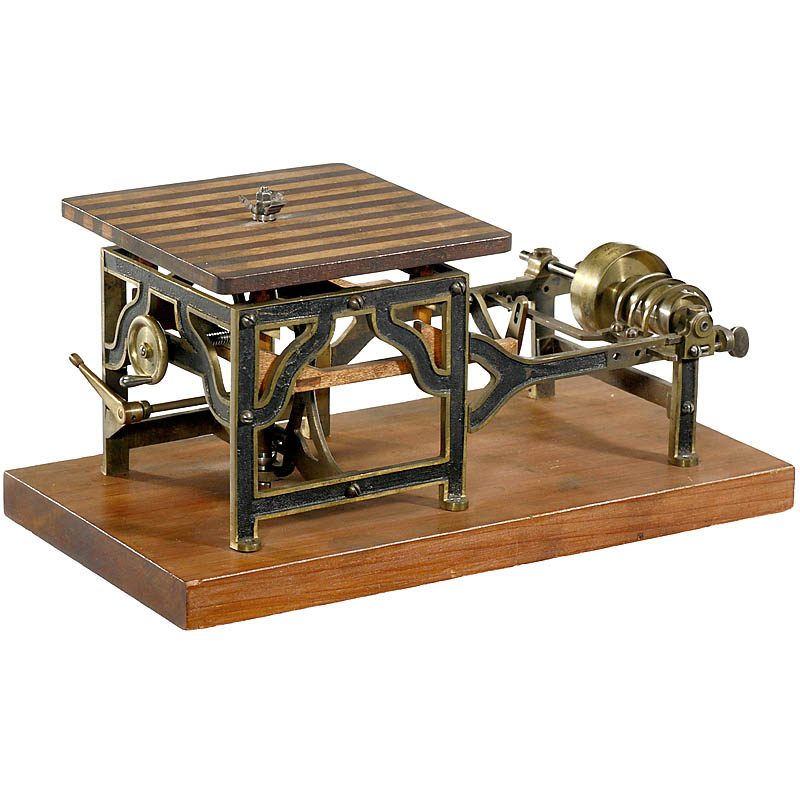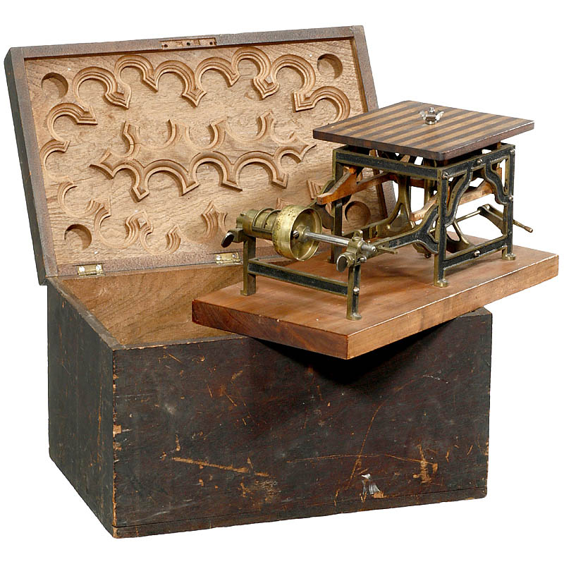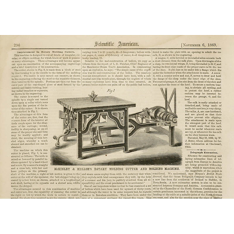 Working model of a rotary molding cutter and molding machine by "McKinley & Mellor, USA", made of brass, wood and steel, size: 12 ¼ x 6 ¼ x 6 in., in corresponding wooden box (lid inside shows samples of machine results). – And: Full year issue (1869) of "Scientific American" with an accompanying article on this machine.