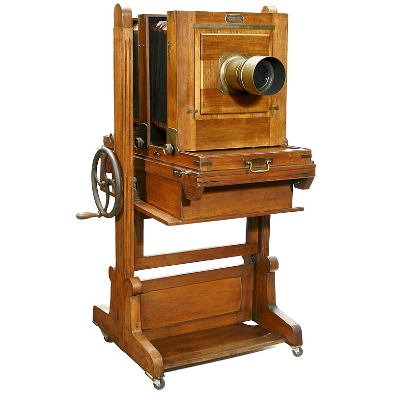 Fabrique d'Appareils Photographiques de Precision BteS.G.D.G. E. Lorillon, 巴黎. 背面: Schrambach,巴黎. 单页尺寸40 x40 cm, 移动片匣和调焦屏幕背面(尺寸 24 x 24cm),带黄铜配件的红木机身,脚底板 54 x 100cm., 双拉装置,三角架高度: 156cm.,曲柄机制,齿条和小齿轮聚焦的未标识黄铜镜头, 镜头高度,含镜盖25cm, 不连镜盖15cm ! –精装饰!