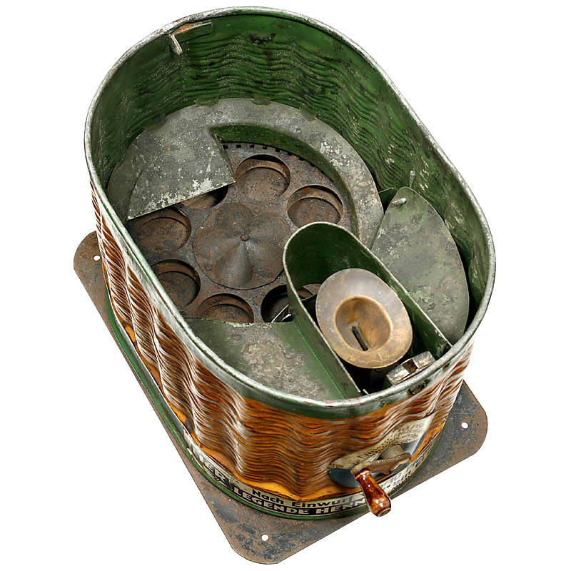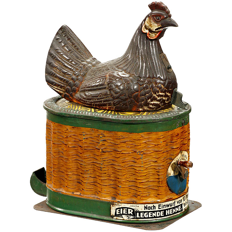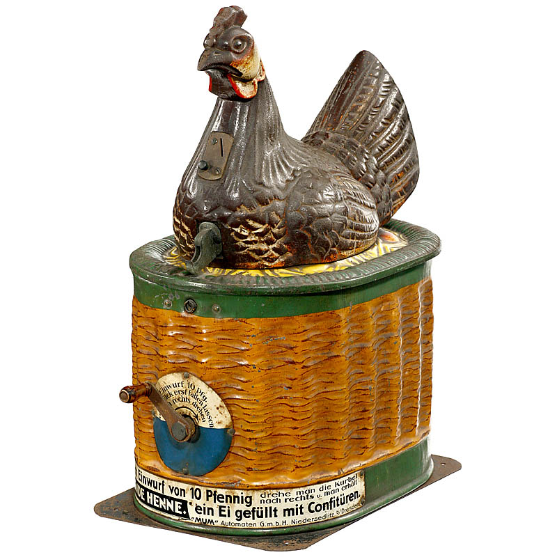 Manufactured by "MUM Automaten GmbH, Dresden", used to sell sweets in tin eggs, tin case with cast-iron hen, coin slot for 10 Pf, with inbuilt bellow for the creation of the clucking, good original condition, working.