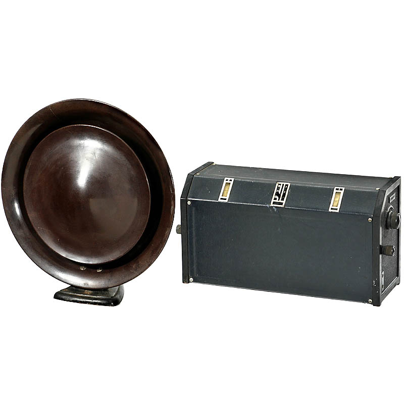 First mains-powered radio by Philips, 110 V, on circuits, well-constructed, medium- and long-wave, with 220 V adapter. With loudspeaker "Philips type 2015", case with small crack.