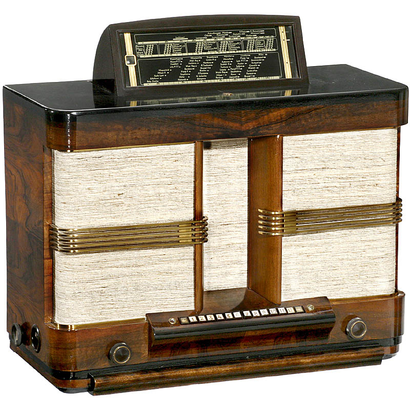 Large 8-valve receiver, short-, medium- and long-wave, tuning with motor, 12 station keys, folding scale, rear panel renewed, case newly lacquered.