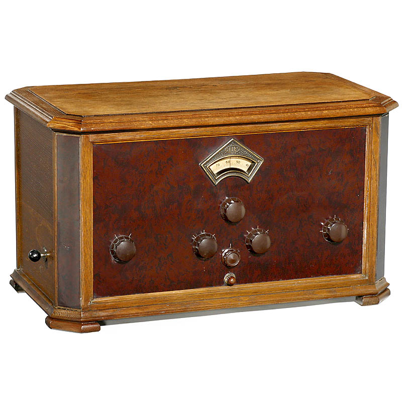 Large battery-operated 4-valve receiver, long- and medium-wave, nice construction with large brass rotary capacitors and copper shielding, with battery wire.
