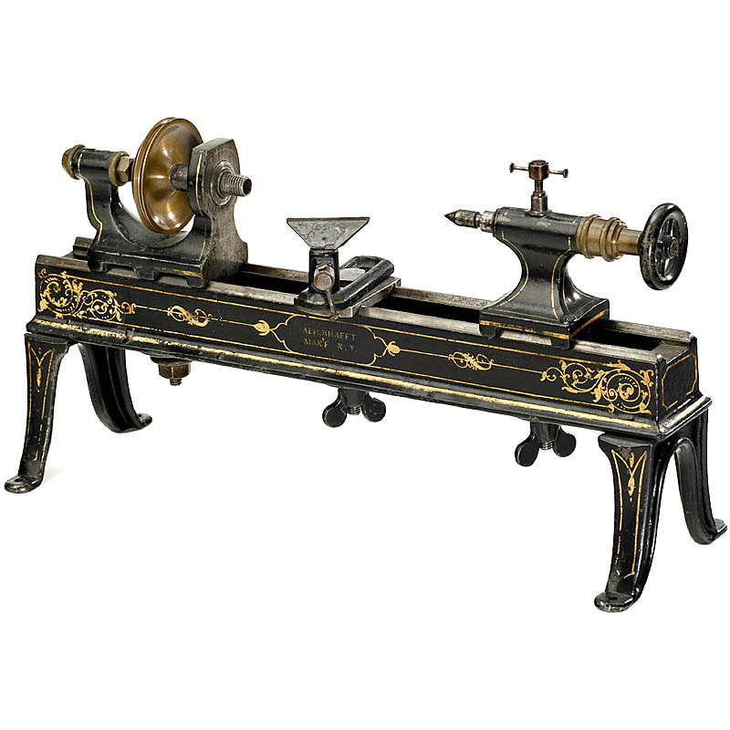 Marked: " Alb. Krafft, Man'f N.Y.", made of cast iron, brass and steel, japanned, outstanding golden paint decoration, no tailstock, length: 13 in., very good condition, extremely rare!