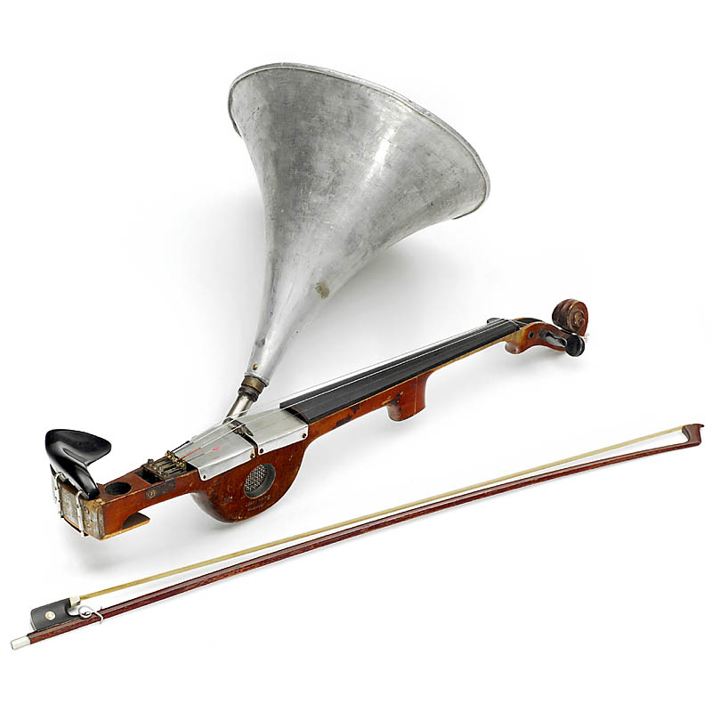 Manufactured by: "Jiernberg, Budapest", 4 strings, soundbox in the body, aluminum horn, with bow, working.