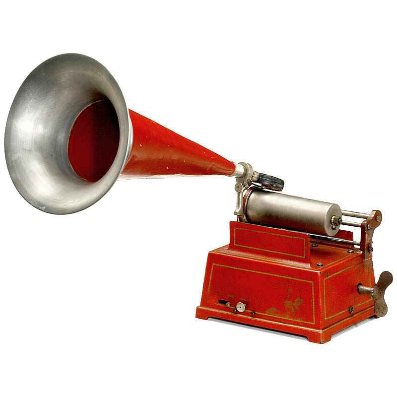 French phonograph for 2-minute cylinders, orange colored cast-metal case, key-wound, aluminum horn, clockwork motor works, soundbox loose.