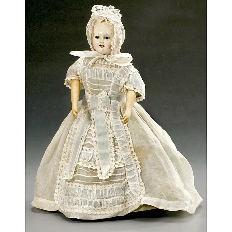 With papier-mâché head, black glass eyes, open mouth with four bamboo teeth, painted black hair accented with brushstrokes, replacement wooden arms, green-painted platform with 2 3/8 in. spoked back wheels, and 1 1/8 in. off-centre front wheel, going-barrel movement and two cranks causing figure to move in a circle, turn her head and raise her right arm, in lawn dress and bonnet, height 9 ½ in. (24 cm). Working condition.