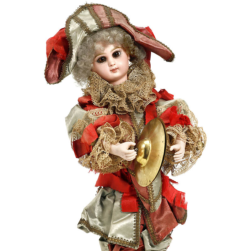 With Jumeau bisque head stamped in red "Déposé Tête Jumeau, Bté. S.G.D.G. 1" and artist's mark "HV", accented closed mouth, fixed brown paperweight eyes, light brown feathered brows, pierced ears, original grey fleecy mohair wig on cork pate, slender papier-mâché body and bisque hands holding cymbals, on velvet-covered base with going-barrel movement playing single air "Mandolinata" and causing the figure to shake his head side to side and strike the cymbals together, dressed in the original well-preserved two-tone costume, upturned shoes and matching bi-corn hat trimmed with lace, ribbons, bells and metal-thread, height 16 ½ in. (42 cm), small repaired flake on lower left eyelid, light freckles in bisque, chip on left elbow – covered by costume, with tune-sheet, Lambert key and stop/start, preserved in exceptionally fine condition in original maker's box inscribed "Polichinelle....7564", box length 20 ¾ x width 8 ¼ x height 8 in. (52 x 21 x 20 cm), lid split. Very good working condition. Especially beautiful automaton in fine original condition.