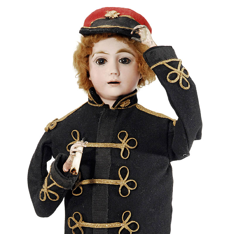 With Jumeau bisque portrait head (height approx. 4 in.) stamped in red "Déposé Tête Jumeau, Bté. S.G.D.G. 9" and artist marks "HVIII", modelled as a young man with defined features including aquiline, open mouth with accented lips, large fixed brown paperweight eyes, finely painted lashes and light-brown feathered brows, pierced ears, auburn sheepskin wig, metal hands, going-barrel mechanism in the body with three cams and four levers causing soldier to turn and nod his head, bring a lighted cigarette to his lips, exhale and raise his left arm to his hat as though saluting, the smoke cycled from the cigarette-holder in his left hand to his mouth via bellows in the body, in original red felt trousers and later wool military jacket, height 22 ½ in. (57 cm), paint wear on left hand, scattered freckles in bisque, bellows need overhaul. Rare smoking automaton with a specially-commissioned bisque head by Jumeau. – A spectacular collector's item.
