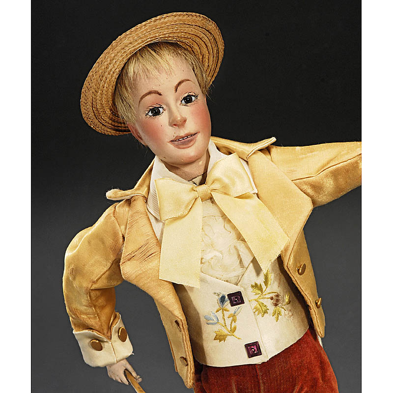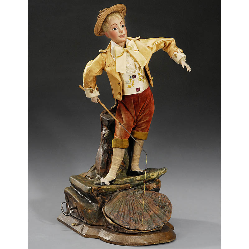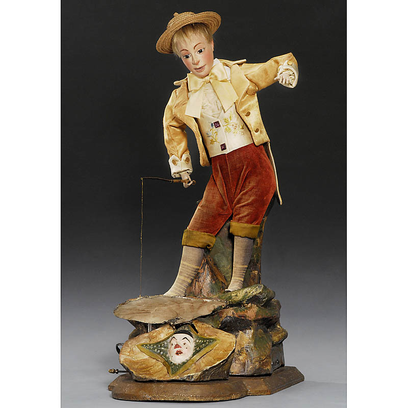 With composition head modelled as a boy with rosy cheeks, upturned nose and smiling brown glass eyes, original hair wig and painted metal hands, poised on papier-mâché rock above a scallop shell with hinged lid attached to the end of the boy's fishing line, the going-barrel movement in the base, stamped "G. Vichy, Paris", driving two cams, three levers and a replacement 19th century two-air cylinder musical movement of the correct type, in part-original costume of peach satin tailcoat with silver lining, embroidered waistcoat, red velvet breeches, striped stockings and leather shoes, height 18 ½ in. (47 cm), with "acorn" stop/start, in working order, paint is original and well-preserved, minor retouch to tips of starfish. –  The fisherman moves both arms and nods his head as he attempts to reel in the enormous catch, but to his surprise the shell reveals not a pearl, but a starfish with the face of a Pierrot saucily sticking out its tongue. Accompanying the automaton is part of a Henry Vichy tune-sheet, with his initials and distinctive moon-faced trademark, discovered rolled up inside the costume. It reproduces the first verse of the French folk song "Au Claire de la Lune, Mon ami Pierrot" and also includes a reference to the Lioret phonographs which were fitted in certain Vichy automata during this period. This provides a fairly accurate production date of between 1895, when the Lioret system was introduced, and 1900, when Henry Vichy effectively left his father’s firm.
