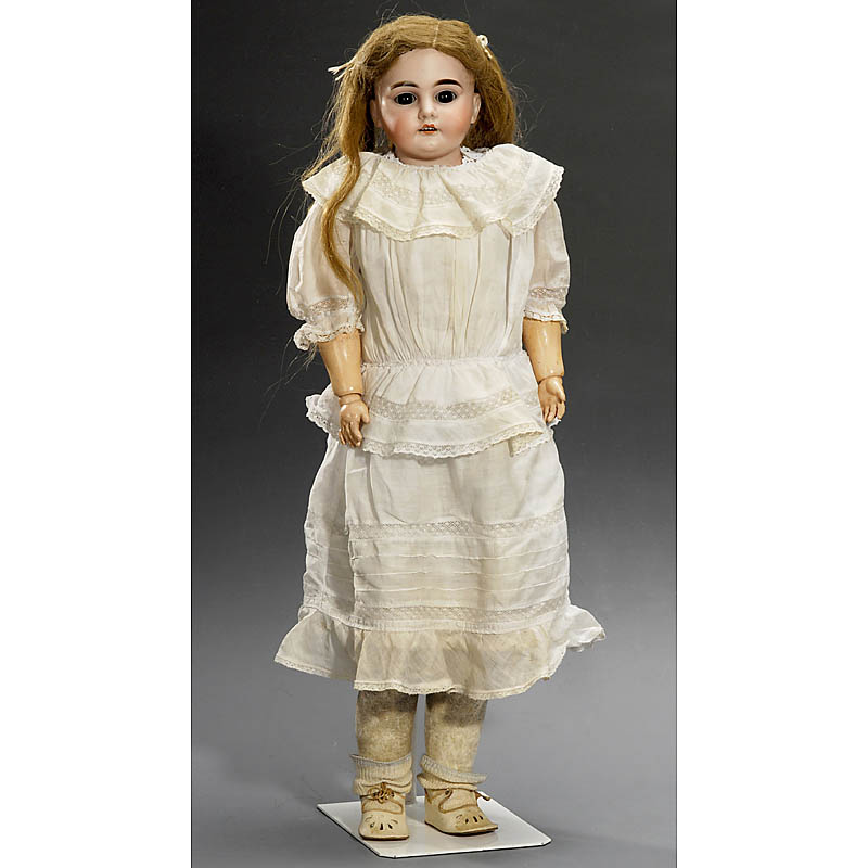 Impressed "3200 A.M. 10 DEP", with weighted brown glass eyes, open mouth with four porcelain teeth, firmly-fixed period brown hair wig, leather body with jointed wood arms and composition hands, wearing an attractive batiste dress, camisole and leatherette shoes, height approx. 28 in. (70 cm), small mould flaw on shoulder plate, two minor cheek rubs, old repair on right hip.