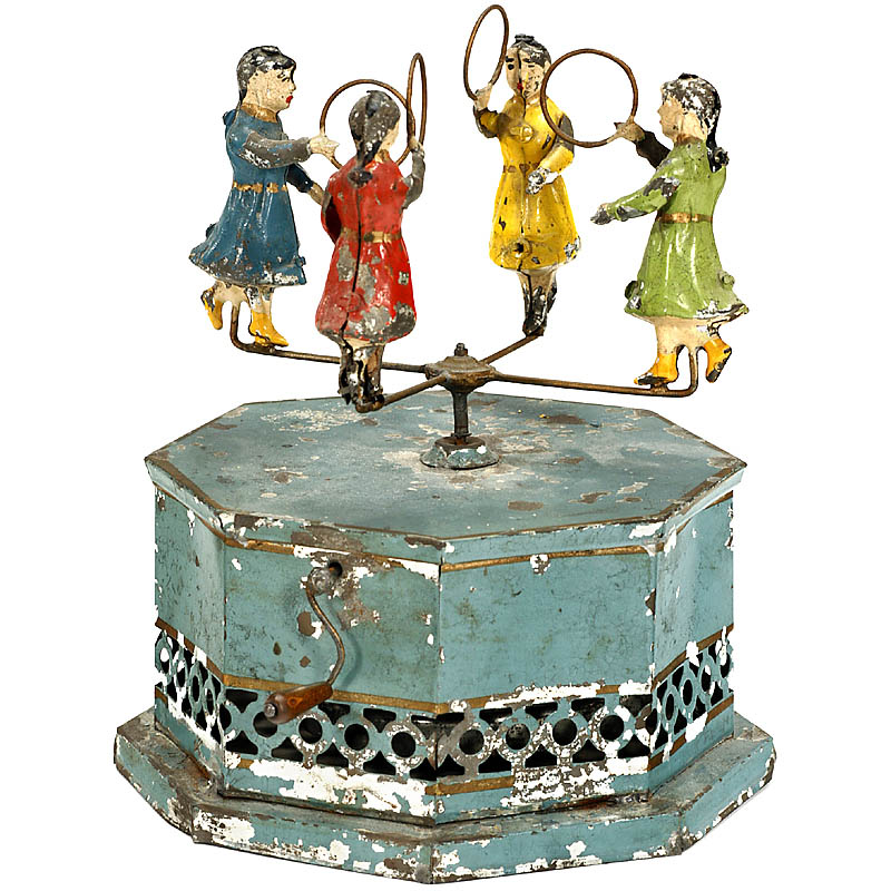 Unmarked, hand-japanned tin, handcrank-operated, with a simple musical movement, Ø 6 in., works well.