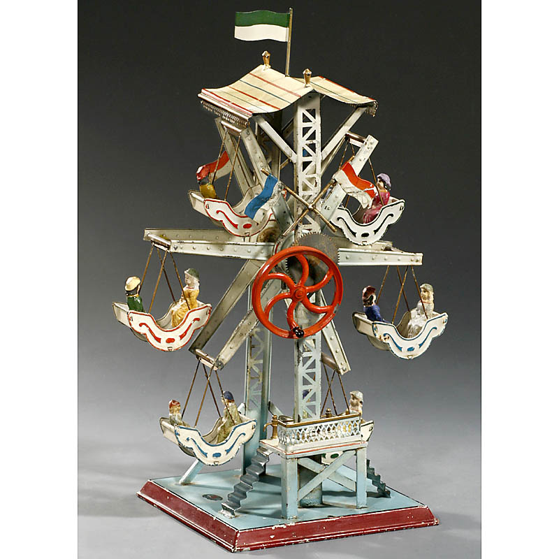 Manufactured by: "Doll & Cie.", Nuremberg, hand-painted tin, figures made of composition material (1 missing), driven by handcrank or steam engine, height: 15 ¾ in., good original condition.