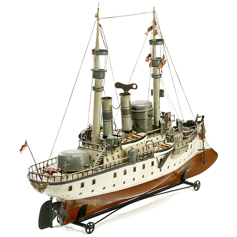 Type "Kurfürst Friedrich Wilhelm", for the French/ Belgian market, named "Jaure Guiberry". Hand-painted tinplate (original condition, without any touch-up), strong clockwork motor (working!), several decks, adjustable rudder and wheel, 2 funnels, 2 masts with crows nests, 2 turnable turrets, 13 cracker cannons, 4 lifeboats (!), anchor on chain, rigging, on stand with 4 cast-iron spoke wheels, overall length 34 ¾ in. Very hard to find in absolutely original condition and of this quality! – A spectacular collector's item and exhibition piece!