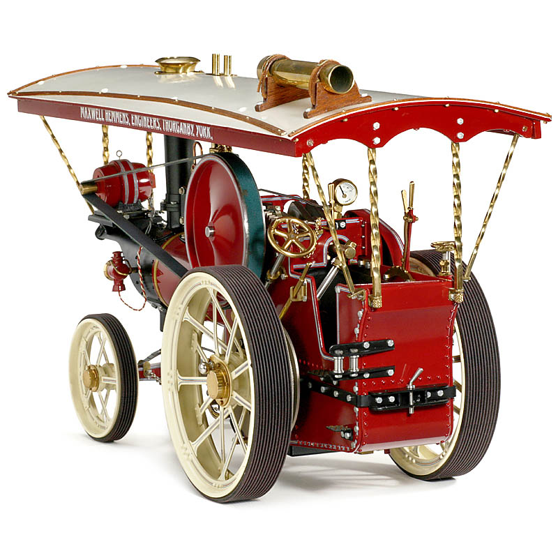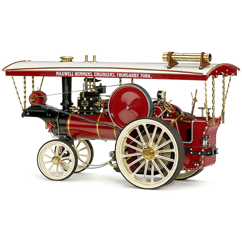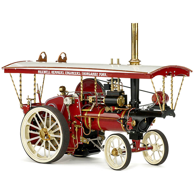 Manufacturer: Maxwell Hemmens, Engineers, Thorganby, York, reversible, 2 gears, steerable front axle (with chains), parking brake, manometer, electric lighting, fixed cylinder Ø 1 ¼ in., boiler Ø 2 ¾ in., flywheel Ø 4 ½ in., overall size: 21 7/8 x 7 7/8 x 15 ¾ in., complete with all fittings. In as new unfired condition. Fascinating model of first-class engineering quality.