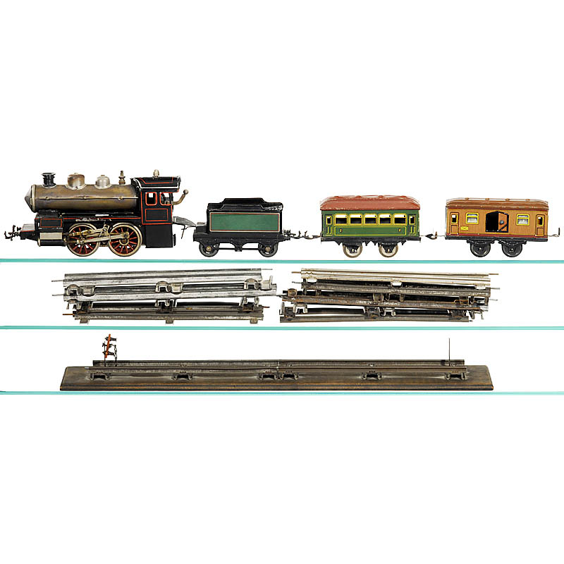 No. 1601585, fixed cylinder, reversible, lithographed tin, length 15 1/5 in., complete with burner, 12 rails and 2 wagons.