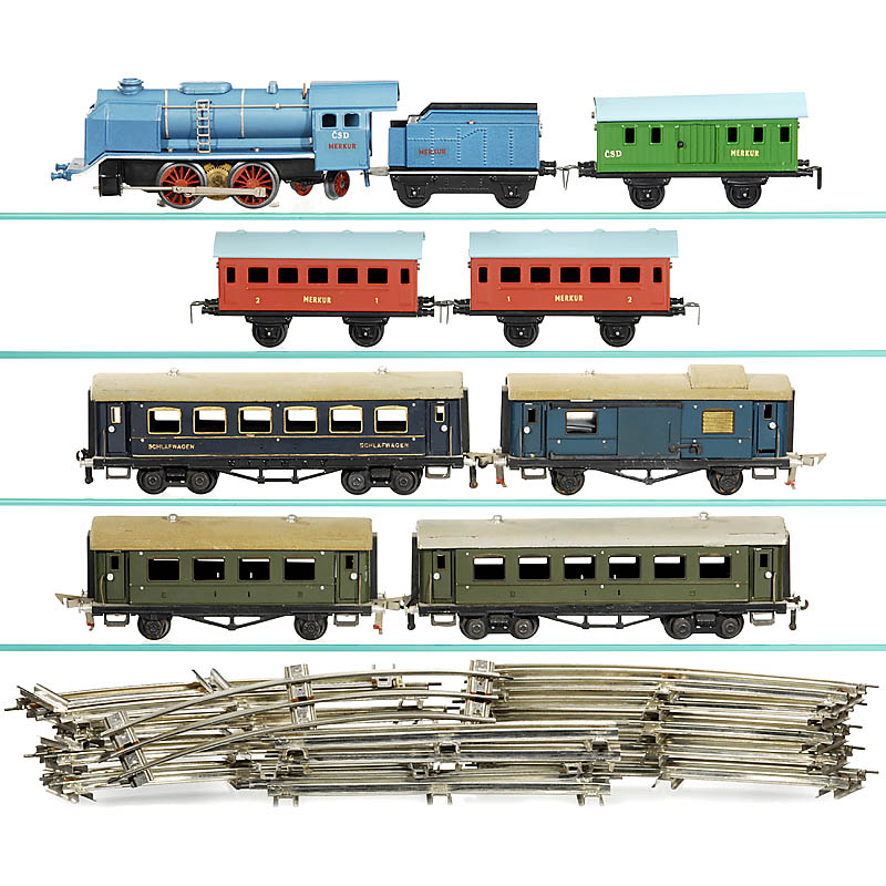 1) Steam locomotive "Merkur CSD" with 3 passenger wagons, painted tin, electric motor, with 16 rails.