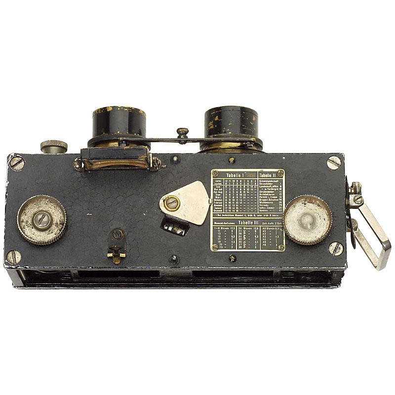 唯一一个举世闻名的样品! 立体相机用于 35 mm 胶片, 单张照片格式 33x45 mm, 两支“Minigraph, 柏林”镜头, 覆盖画面曝光计时器, 德国曝光表, 牛顿取景器, 大机身, 无覆层:18.5x6, 5x5.3 cm, 黑漆, 快门需调节. 出处:Waack, 柏林 Askania 相机公司的设计者, 同时长期担任德国 DSG(German Society of Stereoscopy)的主席. 是一件极为出色和意义重大的收藏品