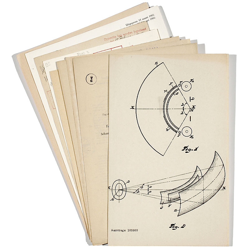 9份专利说明(3份德国的,4份荷兰的,1份法国的,1份瑞士的),1935-1965年期间. De Oude Delft, Philips 及其他,题为:反射镜头,全景照相机,快门,光圈,带电接头的快门按钮