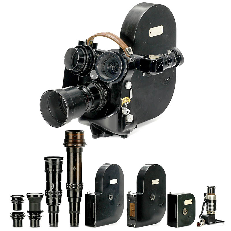 Eclair,巴黎. 单反相机,适合装35mm胶卷的120 m片匣,此相机包括一支附加的变速器以及一块可放倒的图窗.卡口处有3支镜头: Kinoptik,巴黎: 1:2,8/32 mm, 1:2/50 mm ,1:2/100 mm. 附带镜头:超广角Kinoptik镜头 1:1,8/9,8 mm, 1:2/18 mm, 1:2/40mm, 1:3,5/300 mm, 1:5,6/500 mm. 共8支镜头.同步马达.1支适合装30 m 胶卷的片匣,3支适合装120 m 胶卷的片匣,电线有开关,原装箱.–顶级专业相机.