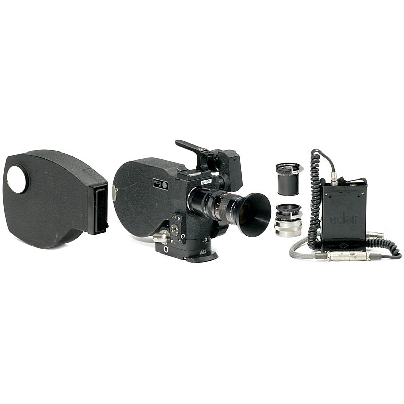 Éclair, 巴黎.低噪音16mm 相机.适合装60m 或120m 胶卷的外接片匣.马达驱动, 单反取景器带棱镜放大镜,Fujinon变焦镜头 1:1,8/17,5–105 mm,Kinoptik 18mm与28 mm 镜头. 装60m 和120m胶卷的片匣, 电池,电线,放大镜适配器和法语宣传测.电力功能未检测