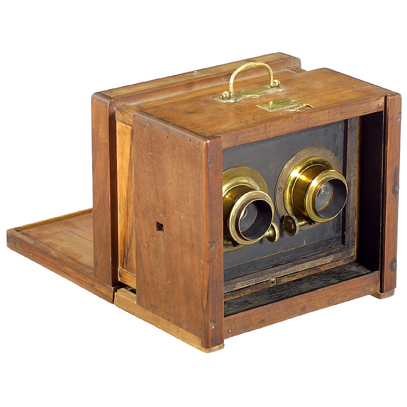 这台著名的立体相机可能出自法国制造商“Dubroni”, 它的镜头有别的制造商制造,包括制造商 Darlot,同时也是第一支雕刻他们名字的镜头,相机上有清楚的胶棉痕迹,原物主:“Hermagis/Paul Marillier”, 巴黎. ---一件奢华的收藏品!