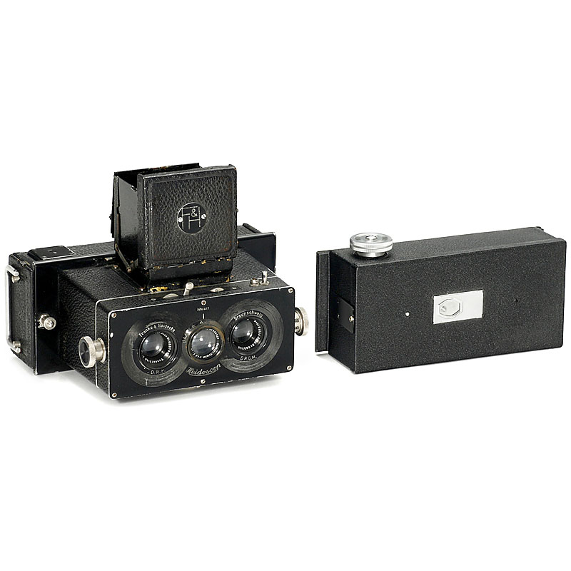 Franke & Heidecke, Braunschweig. 3镜头立体相机, no. 6677. 第二代版本(6 x 13 cm), Tessar 4.5/7.5 cm lenses. 交替式片盒 no. 6812. 带适配的胶卷后背(非原装)
