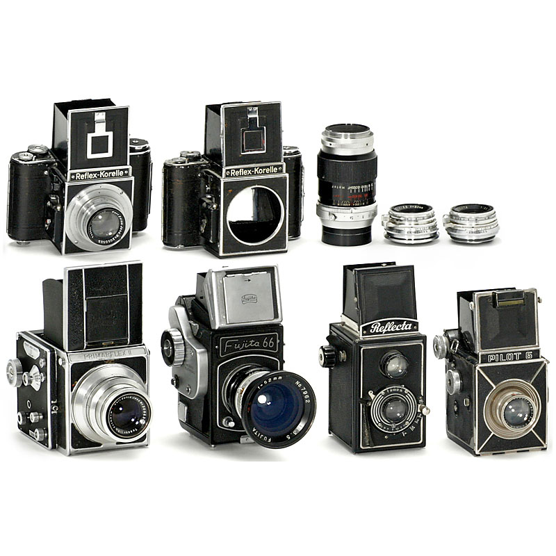 拍品描述: Fujita, 日本. 广角镜头 3,5/52 mm, 2支镜头 Fujita 3,5/80 mm 以及 Fujitar 4/150 mm, 帘幕式快门 (粘涩)