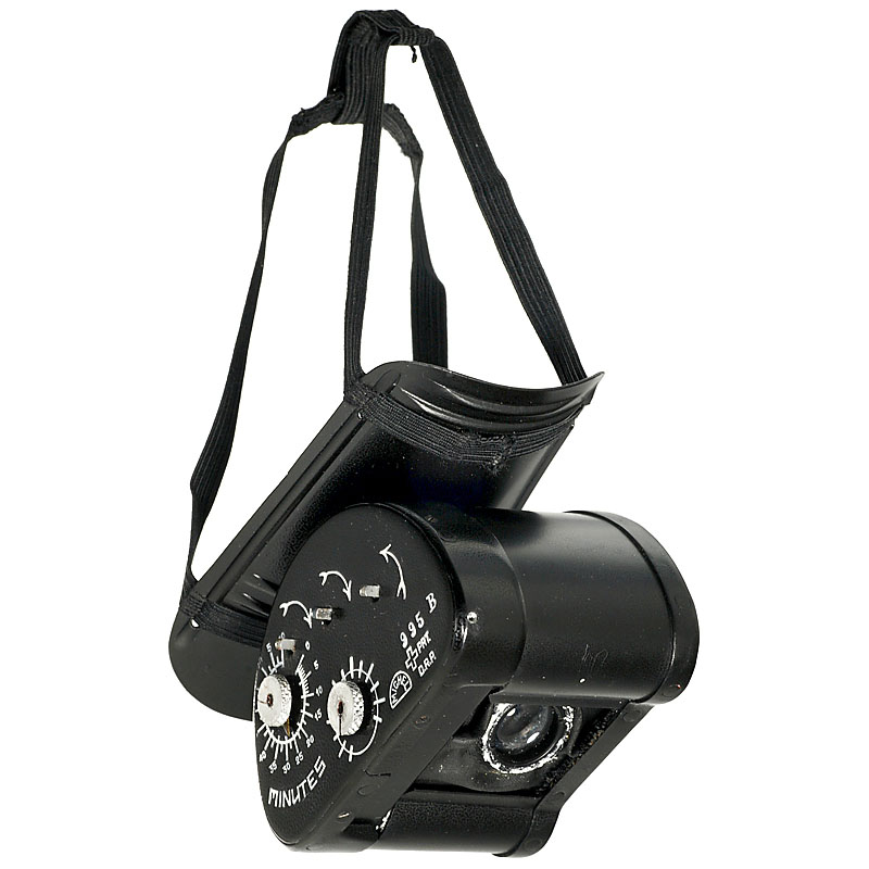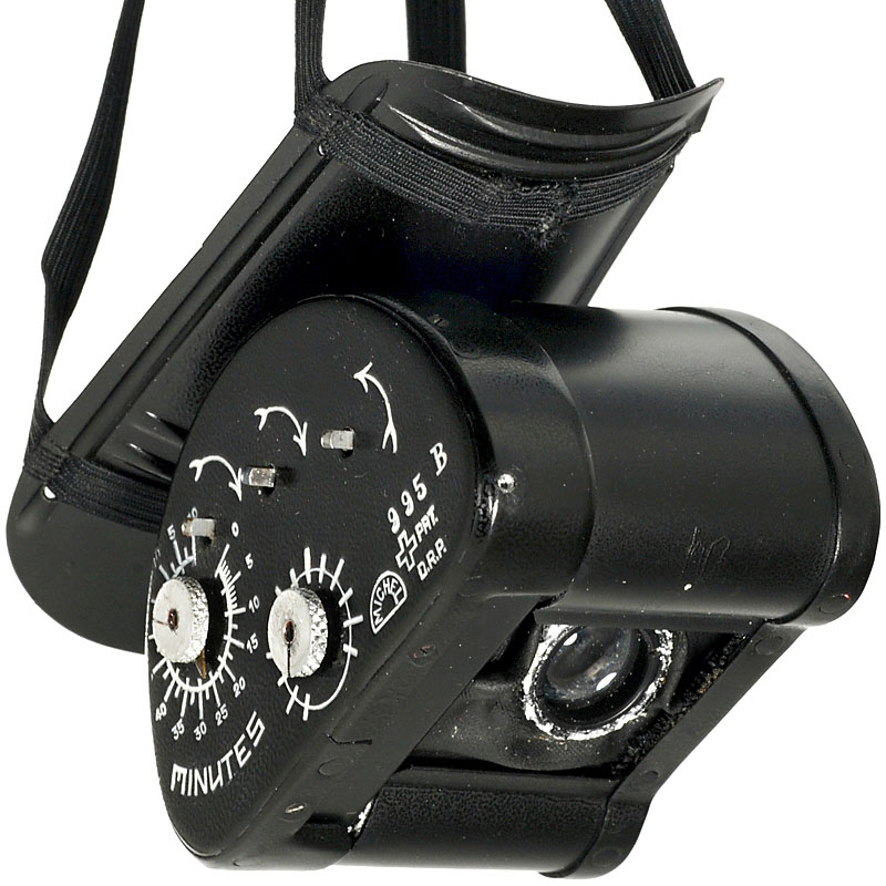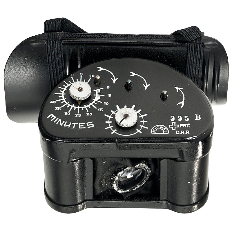 Hand-made by Christian Adrian Michel in Switzerland. Size 39 x 37 x 57 mm (without mounting plate), weight 70 g, for 16mm film. Timer scale: 0–1 hr 10 minutes, exposure time scale: variable 1/300 to 1/500 sec., 3 winding spindles, f/2.5 anastigmatic lens rotated through 90 degrees, with rubberized cloth bellows, 12–15 negatives of panoramic format 10 x 22 mm, at approx. 15sec. intervals,focal-plane shutter, clockwork motor for up to 70 minutes delayed first exposure, 2 internal film spools, mounting plate with original elastic straps, stamps on top plate: Swiss cross/PAT./D.R.P. (Deutsches Reichspatent), stamps on top and base plate: MICHEL. The whitish particles on the alloy-metal indicate that no restoration work has been carried out. During the years, the rubberized cloth bellows has stiffened. Therefore, this camera is sold "as it is" without any guarantee on the mechanics. Along with this camera the buyer receives: Photocopies of French and German instruction booklets, photocopy of Swiss patent no. 192864 (with detailed technical drawings). Provenance: Michel family, thence to a private collector. Christian Adrian Michel (6. January 1912, Biel, 27. March 1980, Walde) constructed his pigeon cameras in the 1930s at Walde in Switzerland. His company Adrian Michel was in the watch production business. He handmade only a few sample pigeon cameras, to demonstrate to prospective clients. He contacted A. Schild S. A. concerning formal manufacture, but this was never carried out. The former employee Franz Bühlmann confirmed that fewer than ten cameras in total were made. On 3. February 1936 Michel applied for a Swiss patent, which was granted (no. 192864) on 15. September 1937. Subsequent patents were obtained: German patent no. 656666, French patent no. 803039, and Belgian patent no. 419488.Until 2002 this pigeon camera was totally unknown to photo-historical experts, to the pigeon communities, and to ex-officers of the Swiss army's homing pigeon unit (disbanded in 1995). The Musée Suisse de L'appareil Photographique in Vevey, Switzerland, launched an exhibition on the Michel pigeon camera on 21. February 2007, showing the archival material that the Michel family had donated to them. An exhibition catalogue "Des Pigeons Photographes?" was published:http://www. cameramuseum.ch /e_basis.php