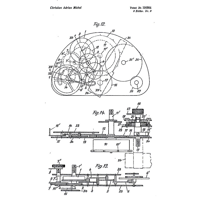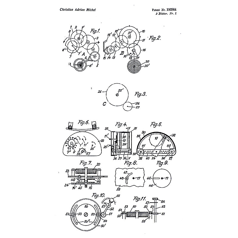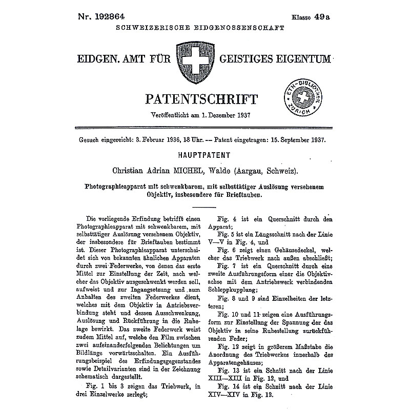 The Michel camera is technically more advanced than the camera designed 1903 (and marketed from 1912 onwards) by Dr. Julius Neubronner of Kronberg, Germany. The Michel camera is constructed like a watch (see the blueprint): indeed world-renowned Swiss watch making expertise went into it. The father of Adrian Michel had founded 1898 the watch producing company Michel S.A. in Grenchen, Switzerland, which was taken over by the Swatch group in 1984. Adrian's mother also founded 1925 another watch company in Walde, which Adrian himself ran from 1935 onwards.