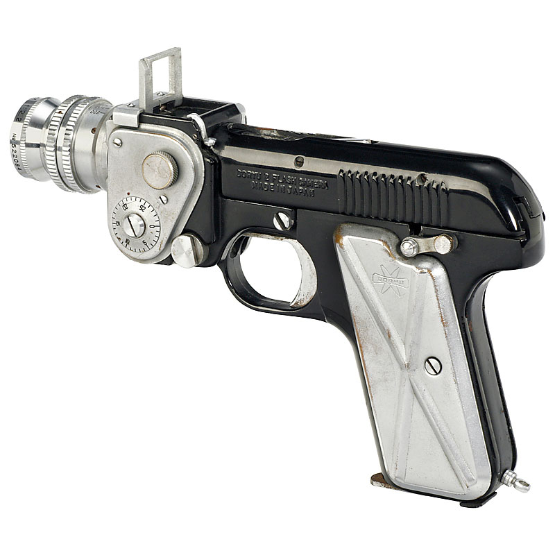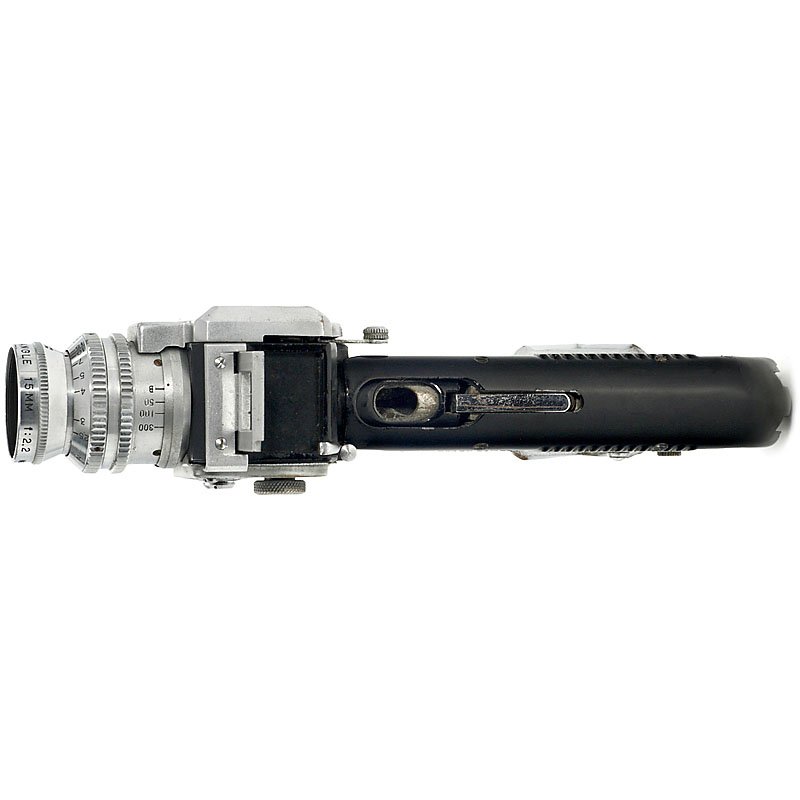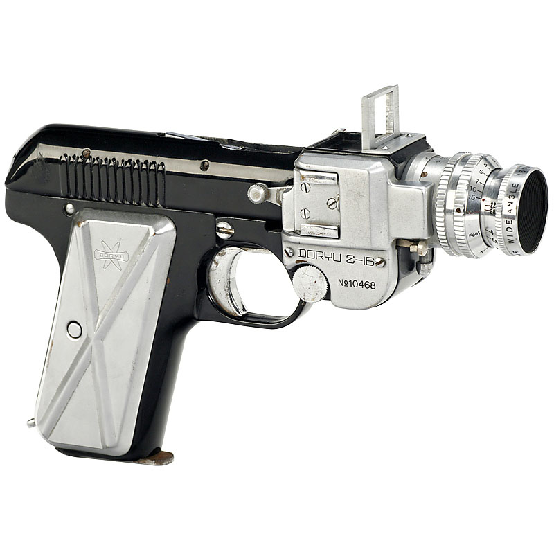 Doryu Camera Co. Ltd., 日本. No. 10468. 手枪式微型相机---非比寻常的设计!片匣 (暗盒) 看似子弹(匣). 16mm 胶片放在特殊的 10 x 10 mm 片盒里, Dorymar 广角镜头 2,2/15 mm, 快门速度 1/50-1/300 秒和 B. 十分罕见的微型相机. – 参考文献: M. Pritchard, "Spy Camera", p. 147