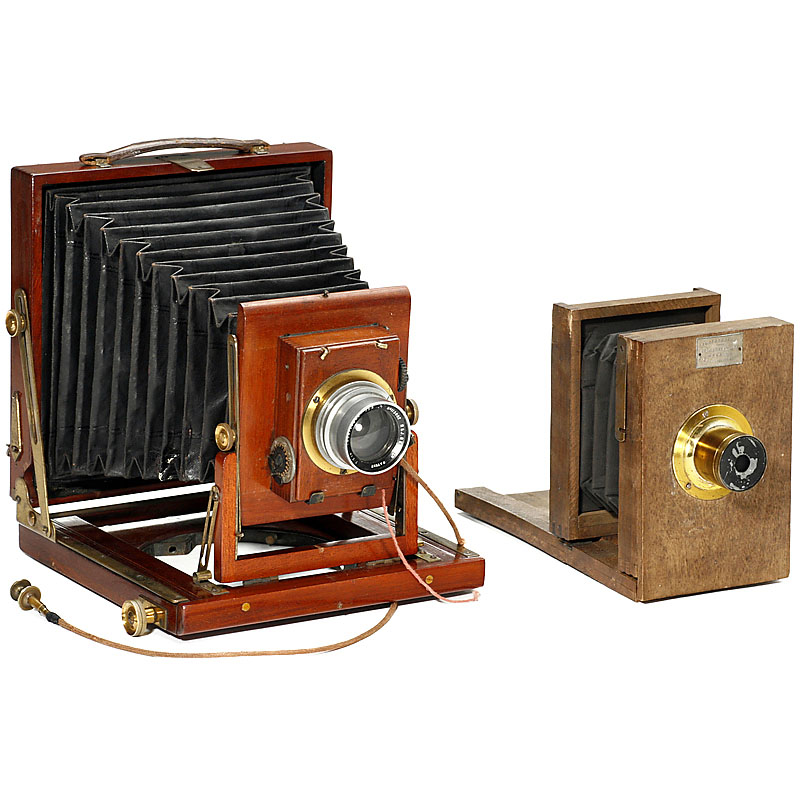 拍品描述: 可能出自英国, 4 3/4 x 6 1/4 in., 贵木质机身带黄铜配件, Beck (贝克) 镜头 Isostigmar 5.6, 帘幕式快门