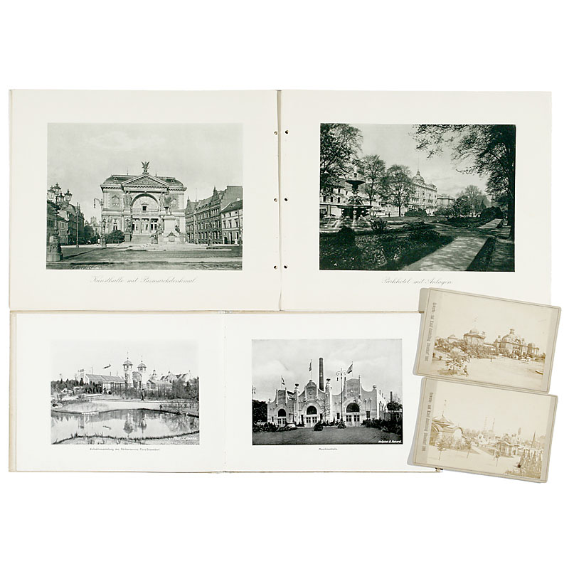 – 1) 2张六寸照片 (10 x 15), 工业与艺术展览的城市 Düsseldorf 1880, Photographische Anstalt von G. Overbeck, Schadowstr. 42.– 2) 书本: 国际性艺术 - 美术史以及园艺展览, Düsseldorf 1904, 7 4/5 x 10 1/5 in., 16页纸以及30张照片/图片.